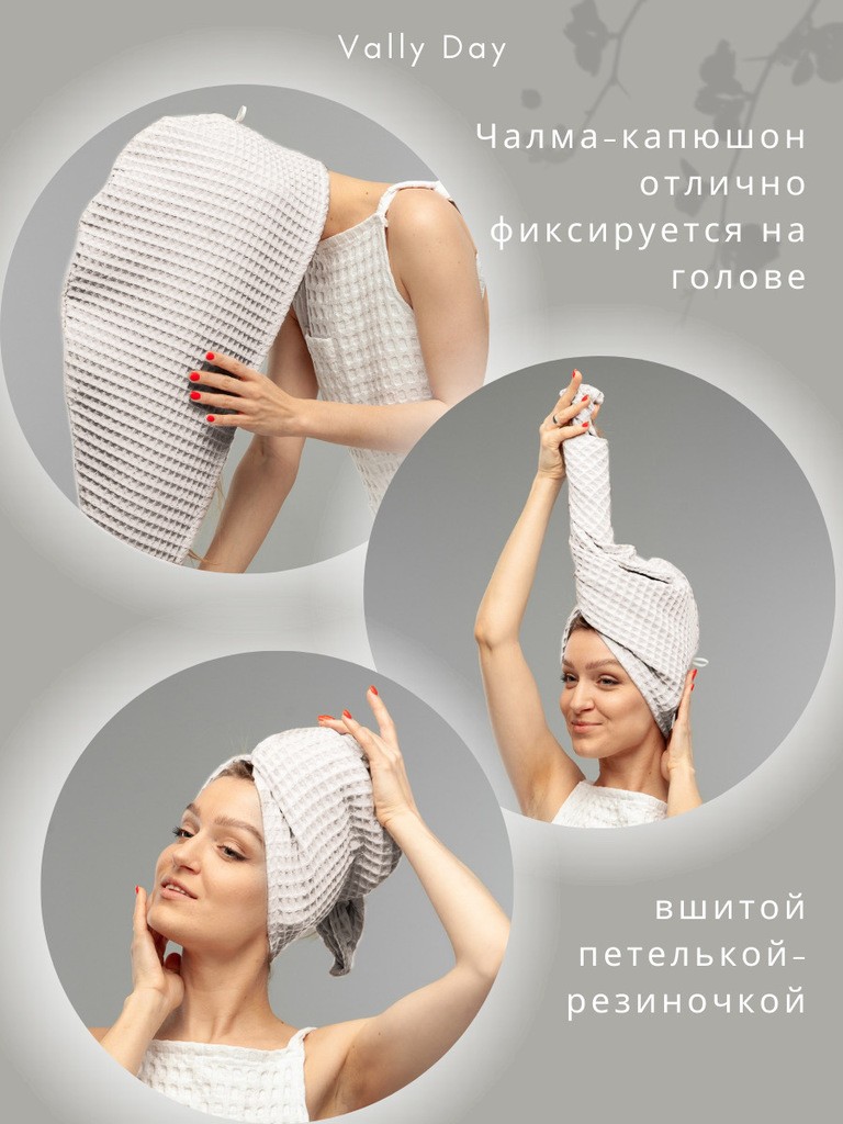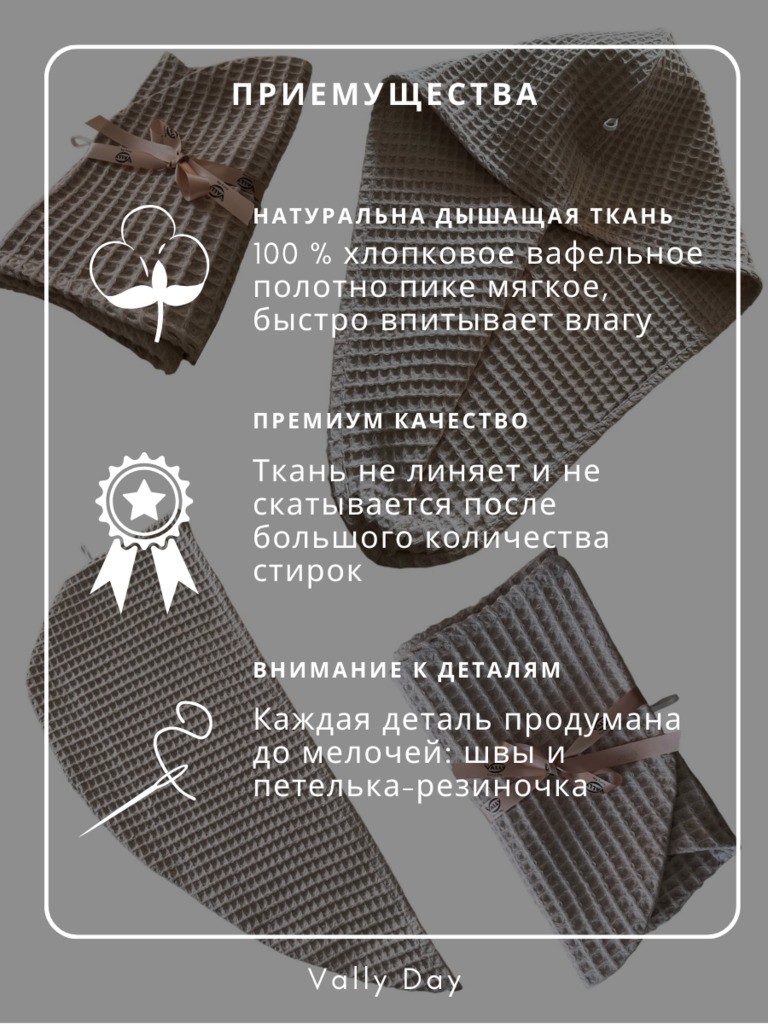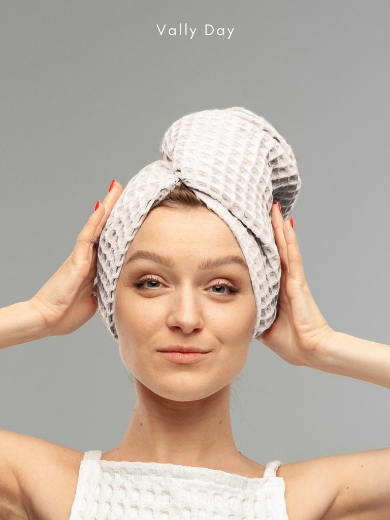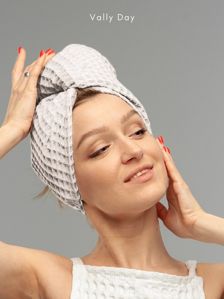 ВЫСОКОЕ КАЧЕСТВО. Тюрбан для волос от бренда Vally day изготовлен из 100% хлопка премиум качества. Специалисты рекомендуют использовать для сушки волос именно вафельное полотно, так как в отличие от махрового полотенца, оно хорошо впитывает влагу и не пересушивает при этом волосы.