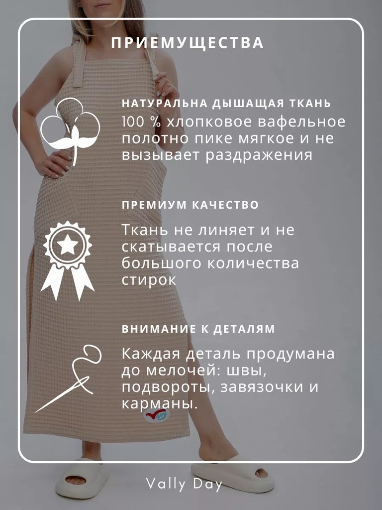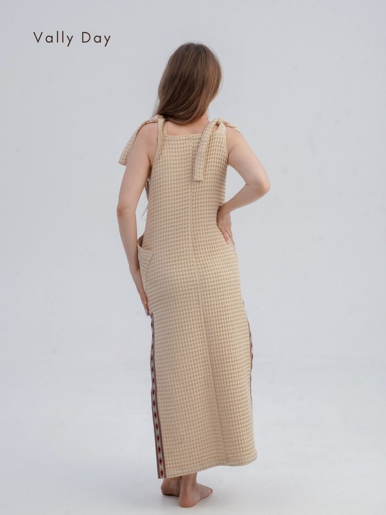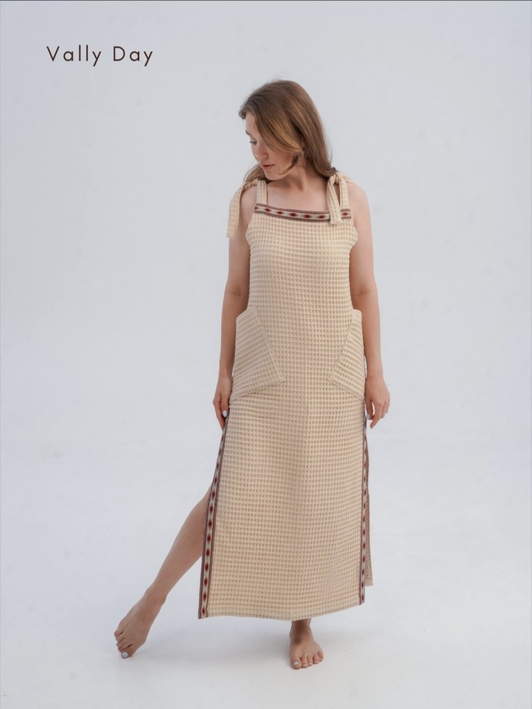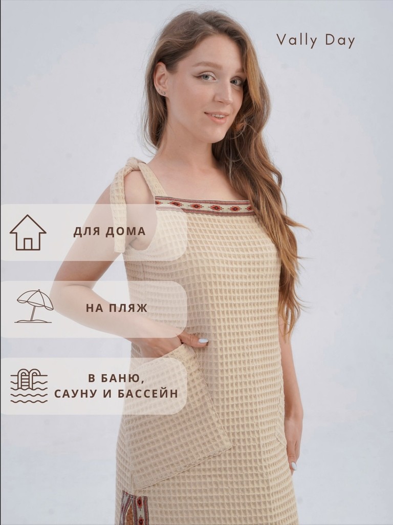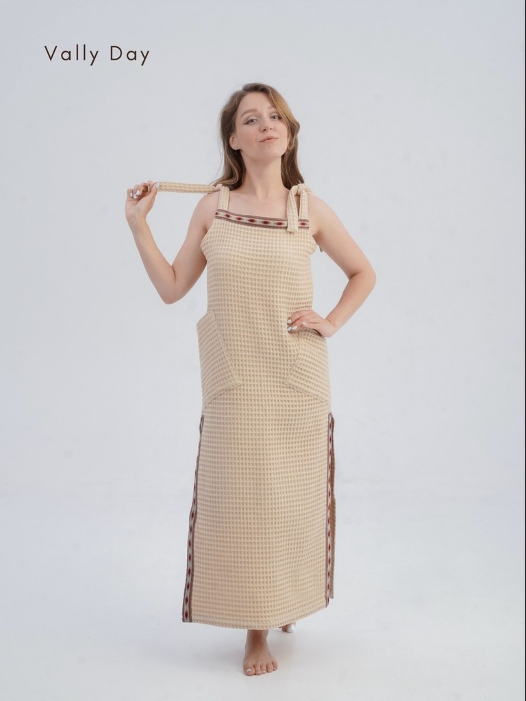 Настоящий подарок для активной девушки, которая не хочет отставать от моды и предпочитает комфорт во всех проявлениях! Милый и свободный сарафан с карманами и завязками на плечиках в комплекте подойдёт для дома, SPA, пляжа и сауны.
